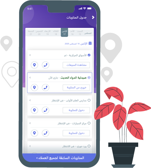 تطبيق تابع يمكنك من عرض تفاصيل المناوبة للمندوب وتاريخها ووقت بدايتها ونهايتها، واسم العميل وجدول بتفاصيل مبيعات المناوبة، وخرائط الدخول والخروج للمناوبة.